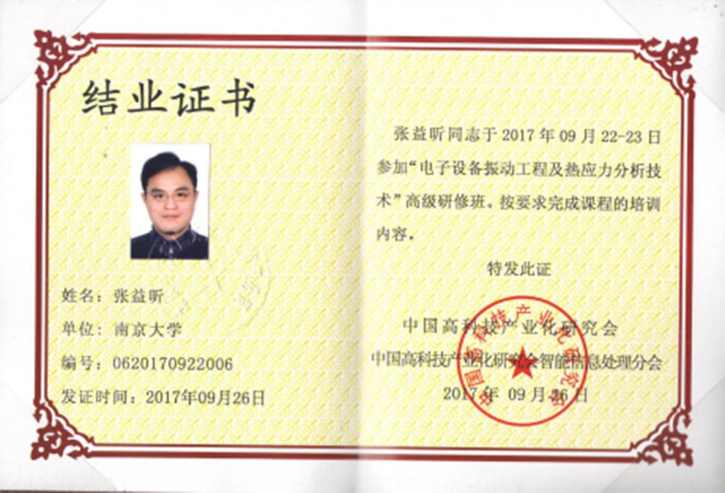 2017年9月22-23日,張益昕副教授赴北京科技大學參加了“電子設備振動工程及熱應力分析技術”高級研修班并順利完成課程培訓內容。